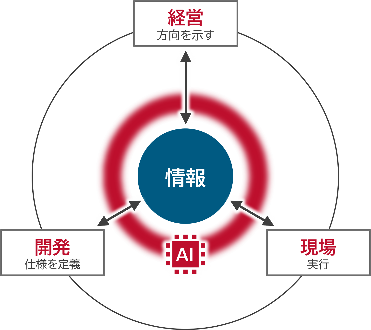 経営が方向を示し、開発が仕様を定義し、現場が実行する流れだ。
